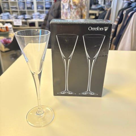 Orrefors More champagneglas i klarglas. Glaset är utformat som ett högt, smalt champagneglas med fot, anpassat för servering av mousserande vin och champagne. Passar för användning vid måltider, fest och andra tillfällen där champagne eller mousserande dryck serveras.