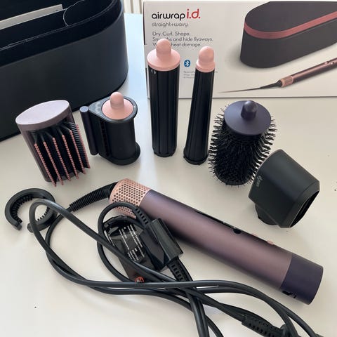 Dyson Airwrap hårstyler i rosa ton med flera utbytbara tillbehör. Setet innehåller basenhet, olika munstycken för torkning, lockning och formning av håret samt en förvaringsbox i matchande färg. Produkten är avsedd för hårstyling i hemmet och kan användas för att skapa olika frisyrer beroende på valt munstycke.