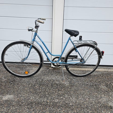 DBS stadscykel för kvinna med ramstorlek 53 cm och 28" hjul. Cykeln har lågt insteg, pakethållare bak, kedjeskydd och stänkskärmar. Färg blå med kromade detaljer. Passar för vardagscykling i stadsmiljö.