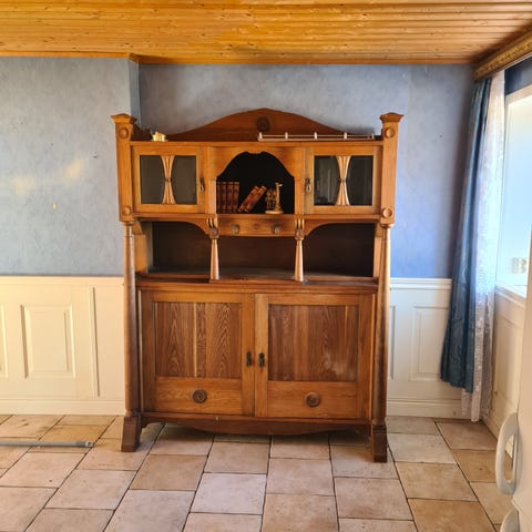 Äldre skänk i trä med tre lådor samt ett hyllplan. Gott helhetsintryck.