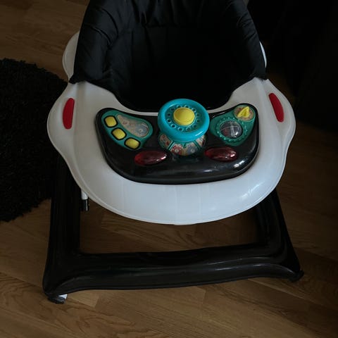 Gåstol i form av en bilmodell i grå färg med hjul. Framtill finns en enkel leksakspanel med röd ratt och knappar. Gåstolen är höj- och sänkbar och har hjul för att barnet ska kunna förflytta sig.