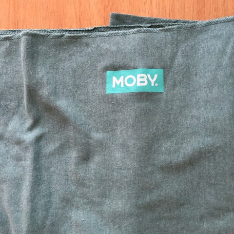 Moby bärsjal i beige färg. Tillverkad i mjuk bomullstextil. Selen är avsedd för att bära spädbarn och mindre barn enligt anvisningarna på etiketten, med flera olika bärpositioner illustrerade. Tvätt- och säkerhetsinstruktioner finns påsydda på sjalen.