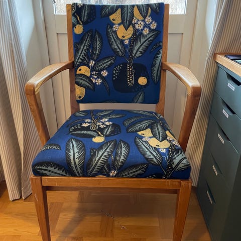 Fin, speciell stol med skiftningar i färgen på armstöden. Sitsen kan man ändra tyg på.