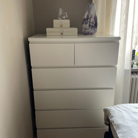 Vit byrå Malm 6 lådor från Ikea. Med glasskiva som går att ta av.