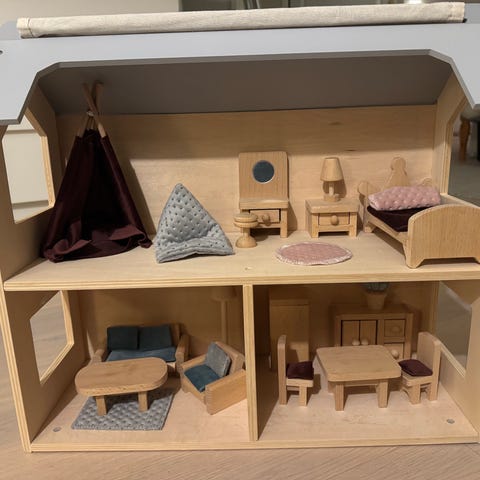 Lundby dockskåp i trä med flera rum för lek i 3 våningar samt vind.