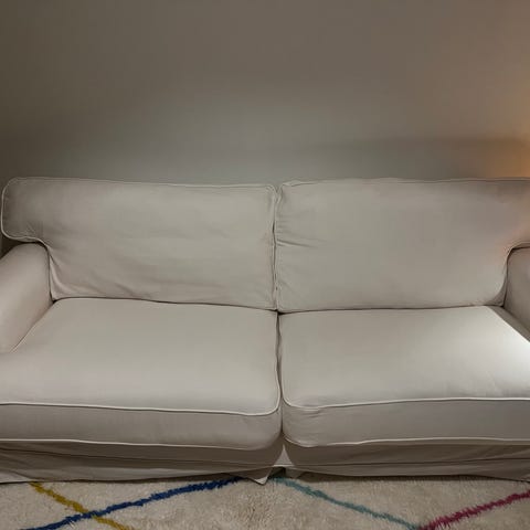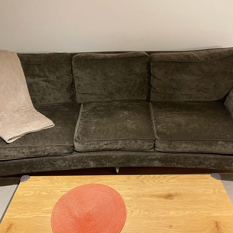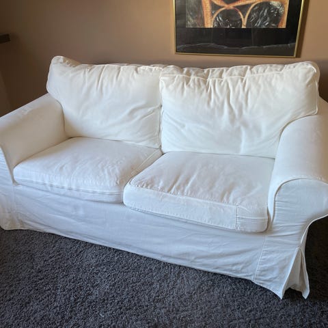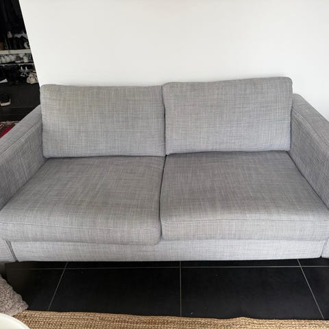 Okej 3-sits soffa. Lite nersutten men är helt ok att sitta i. Det mesta tyg går att ta av och tvätta. Den kommer inte tvättas innan försäljning. Bärhjälp går ej att få. Hämtas i Lönsboda.