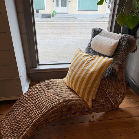 Sprillans ny fåtölj Ikea ORRESLÄTT i naturfärgad rotting med svarta stålben.