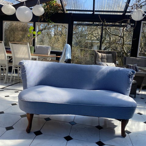 Vacker soffa i klassisk stil med snidad träram och dekorativt tyg i mönstrad design. En riktig blickfångare som passar perfekt i t.ex. vardagsrum, hall eller sovrum.
