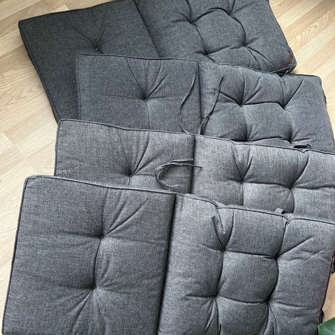 Sittdyneset med blommigt mönster på mörk botten. Dynorna är avsedda för utomhusbruk, till exempel på altan, balkong eller trädgårdsmöbler. Varje dyna har band för fastsättning på stol eller bänk. Mönstret består av större blommor i ljusa och beige toner mot en mörk bakgrund. Passar som sittkuddar för flera stolar eller som lång dyna på bänk.