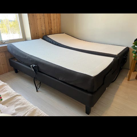 Jysk elektriskt ställbar säng i svart tyg med vit liggyta. Sängen har ställbar fot och ryggdel som kan höjas och sänkas för olika ligg- och sittlägen. Underdelen består av en stabil träram med metallben. Passar som enkelsäng i sovrum eller gästrum. Exakta mått och modellbeteckning saknas.