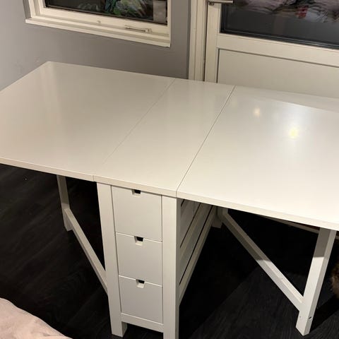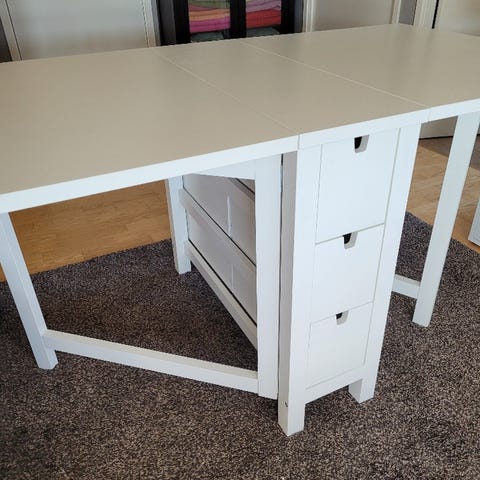 Praktiskt och rejält slagbord i modell Norden, från IKEA. Mått: 26/89/152x80 cm. Finns i butik hos IKEA nu och kostar då 2995 kr. Bordet har en hel del skavanker, och saknar "pinnen" i båda stödbenen (därav priset, se bilder). Gör bordet lite vingligt att ställa ut, men står mycket stabilt när man väl gjort det. Först till kvarn!