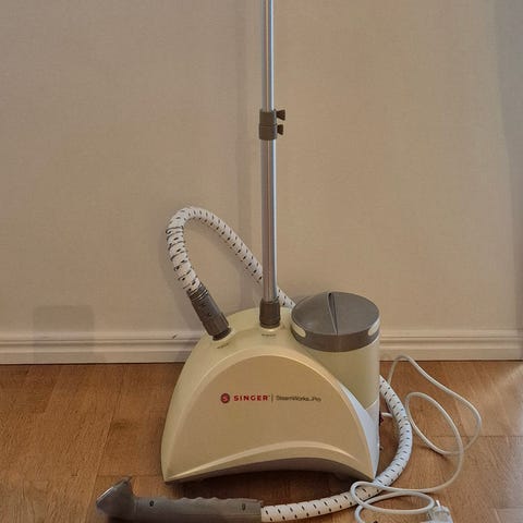 Singer SteamWorks Pro klädsteamer. Golvstående steamer med vattenbehållare, teleskopstång och inbyggd galge för upphängning av plagg. Utrustad med slang och ånghuvud för vertikal ångning av kläder och textilier. Passar för användning i hemmet för att fräscha upp och släta ut olika typer av plagg utan strykbräda.
