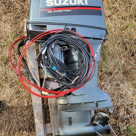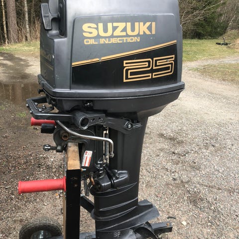 Suzuki 40 hk lång riggad slutet -80 tal med separat oljesmörjning . Startar och går bra manuell start . Ny olja i växthuset och nya tändstift. Säljes med reglars och vajrar.