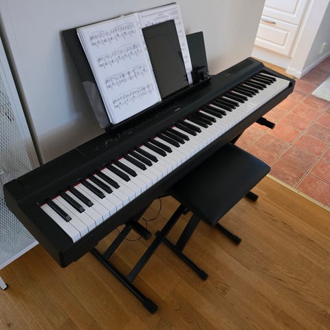 M-Audio digitalpiano i svart utförande. Pianot har fullt klaviatur med vägda tangenter och inbyggda kontroller ovanför tangenterna för ljud och funktioner. Medföljer separat sustainpedal av märket M-Gear. Passar för spel hemma, övning och inspelning i enklare hemmastudio. Pianot har få skavanker så som få färgningar på fåtal tangenter som ni ser på bilden. Annars i super bra skick. Ni får med piano stolen på köpet. Endast upphämtning (: