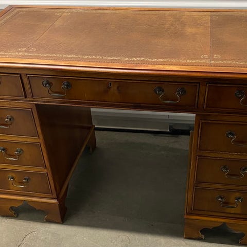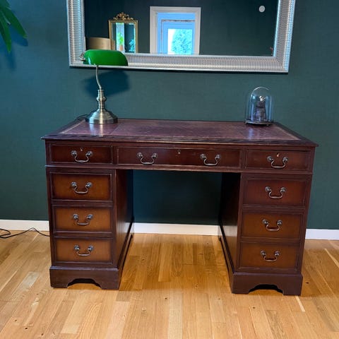 Elegant engelskt skrivbord med ovansida i grönt skinn. Finns att hämta i Malmö.