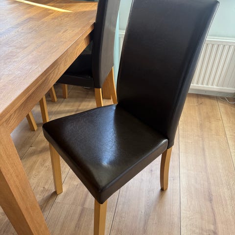 Säljer 6 st Ek stolar med lädersits. Lång rygg som gör dom väldigt bekväma att sitta på.