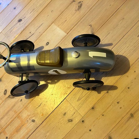 Tramp bil Metall för barn väldigt fint och omålad med Gul färg fixad lite med nyare lampor, allt annat är original inga bucklor passar bra för både utomhus och inomhus eller dekorativ. pris 700 bara seriösa köpare tack