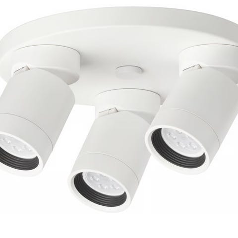 Takspot med fem riktbara spotlights i kromfärgad metall.