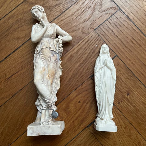 Porslinsfigurer föreställande två barn som håller djur. Figurerna är huvudsakligen vita med flerfärgade detaljer och står på sockelliknande baser. Passar som prydnadsföremål i hemmet, till exempel på hylla, byrå eller sidobord.