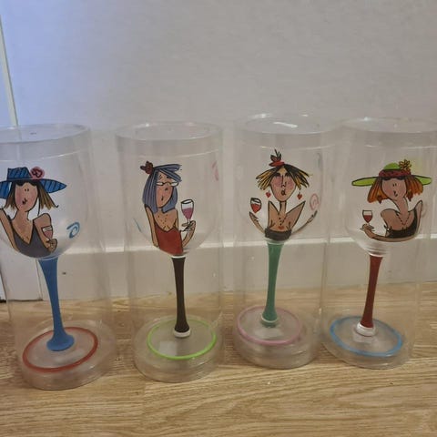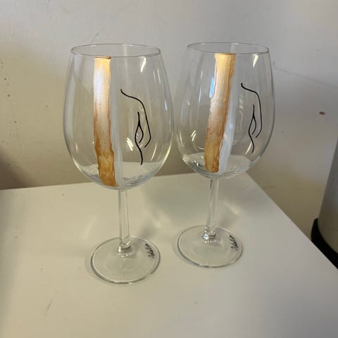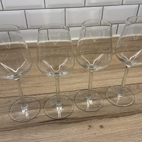 Vinglas i glas med guldfärgad kant. Set om 5 glas. Ett av glasen har guldkanten avskavd