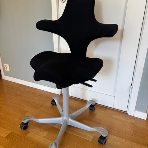 Håg Capisco arbetsstol med klädsel i svart tyg. Stolen har sadelformat säte och ryggstöd utformat för varierande sittställningar.