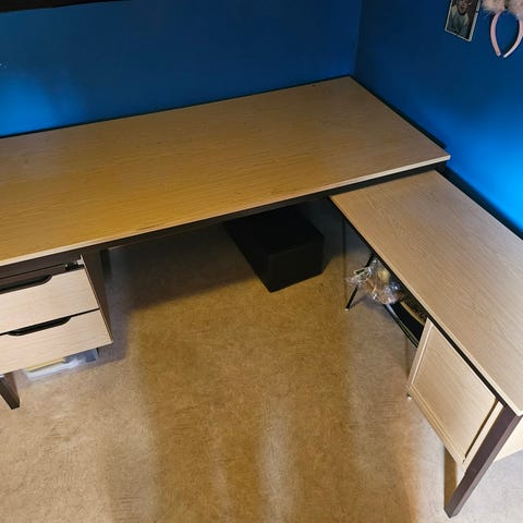Hörnskrivbord med metallben. Består av två raka bordsskivor och en rundad hörndel som ger en L-formad arbetsyta. Till skrivbordet hör en fristående hurts/förvaringsmöbel i samma utförande med öppen hylla upptill, tre lådor med handtag samt ett skåp med dörr och låsbar cylinder. Passar som arbetsplats i hemmakontor eller kontor med behov av större skrivyta och integrerad förvaring.