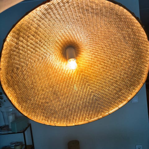 Säljer här en rotting lampskärm för tak inklusive stor lampa samt sladd -mått diameter: 35cm höjd: 50cm