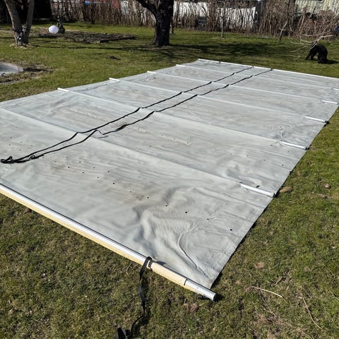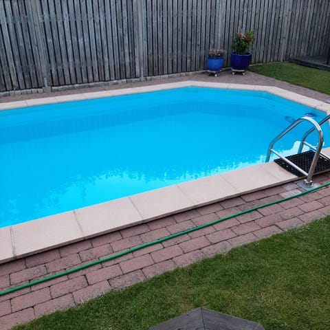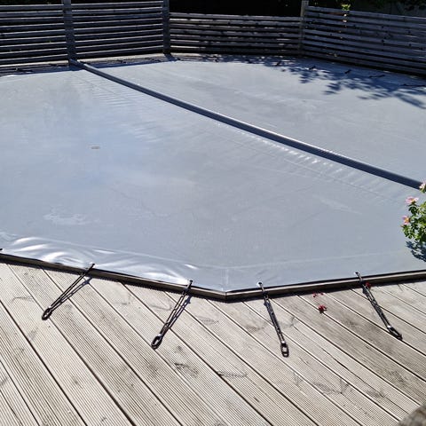 Rullbart poolskydd i vit färg. Skyddet ligger på en rulle som kan placeras vid poolkanten och dras ut över poolens vattenyta. Konstruktionen är avsedd för att täcka poolen när den inte används, exempelvis för att skydda mot smuts och löv samt minska avdunstning. Passar rektangulär pool enligt bilderna 4x8 meter. Materialet består av sammankopplade lameller i hård plast eller liknande, monterade på en axel med ändfästen för placering vid poolen. Elektroniken är utslagen av åska men kan lagas av den händige. Vissa elartiklar måste kompletteras.