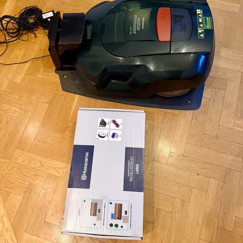 Husqvarna Automower 420 robotgräsklippare med tillbehör. På displayen visas drifttiden och information om klipparen. Till robotgräsklipparen följer diverse tillbehör som lite begränsningskabel, kontakter, skarvar och knivar och även en felsökare till slingan.