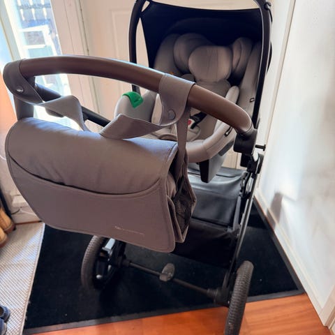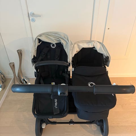 Bugaboo Donkey barnvagn i svart utförande. Vagnen har två sittdelar, varav en kan användas som liggdel, samt en sidokorg för extra förvaring. Justerbart handtag och fempunktssele i sittdelen. Passar för ett eller två barn beroende på hur delarna monteras. Hjulen är stora och anpassade för att rulla på olika underlag. Klädsel och sufflett är i textilmaterial i mörk färg.
