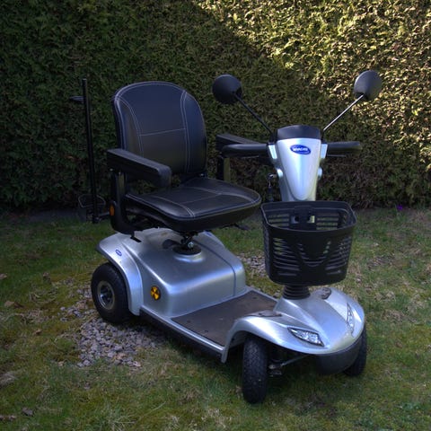 El-scooter med tre hjul i blå färg. Utrustad med justerbart säte med ryggstöd, armstöd och fotplatta. Framtill finns en korg för transport av mindre saker. På styret finns reglage för hastighet, batteriindikator, tuta och belysning. Drivs av laddningsbart batteri och har bakre hjul med stänkskärmar samt belysning och reflexer bak.