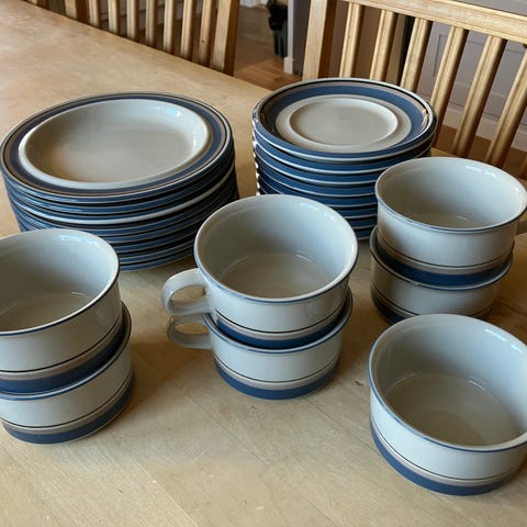 Arabia Landscape porslinsservis i blåvitt mönster. Servisen består av tallrikar i olika storlekar, assietter, djupa tallrikar, uppläggningsfat, kaffekoppar med fat samt kanna. Porslinet har dekorer i blått på vit botten och är märkt Arabia Landscape på undersidan. Lämplig som komplett servis för servering av mat, kaffe och te.