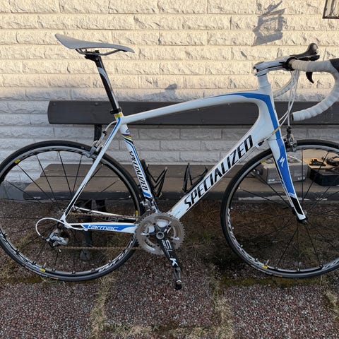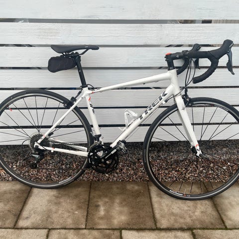 Lapierre 21vxl landsvägscykel i vit och blå färg. Utrustad med bockstyre, smala landsvägsdäck och Shimano-komponenter. Cykeln har två flaskhållare monterade på ramen. Passar för landsvägscykling och träning på asfalt.