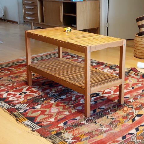 Hylla i bra skick med viss patina/skavanker (se bild), vilket ger den karaktär. Stabil och tung konstruktion , väger minst ca 50 kg.