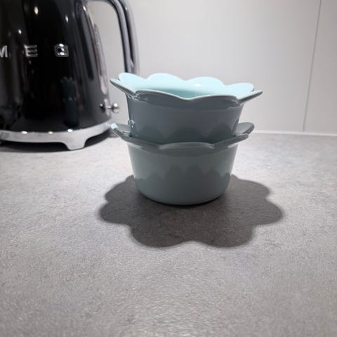 Royal Copenhagen 4 st mugg i porslin i tvåfärgad design, olika färger. Alla är hela, inga kantstötta. Säljes pga att de ej används.