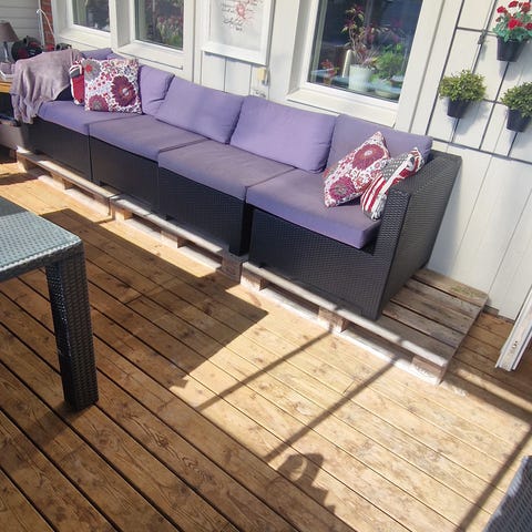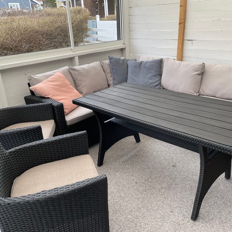 Hörngrupp för uteplats i svart konstrotting med matchande bord. Soffdelen är utformad som en hörnsoffa med plats för flera personer och har mörka sittdynor. Bordet har rektangulär form med glasskiva ovanpå underrede i konstrotting. Medföljande prydnadskuddar har mönstrade överdrag i ljusa färger (finns även svarta kuddar). Passar för användning på altan, balkong eller uteplats.