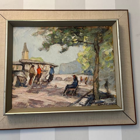 Gammal tavla, oljemålning Karin Skogman, båtmotiv, hamnmotiv, vintage, 40 tal