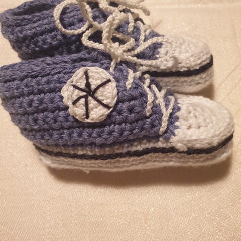Dessa virkade babyskor är perfekta för de allra minsta. Skorna är handgjorda med omsorg och har en charmig design som liknar klassiska sneakers. De är mjuka och bekväma för små fötter. Sulans längd 11 cm. Virkade i bomullsgarn.