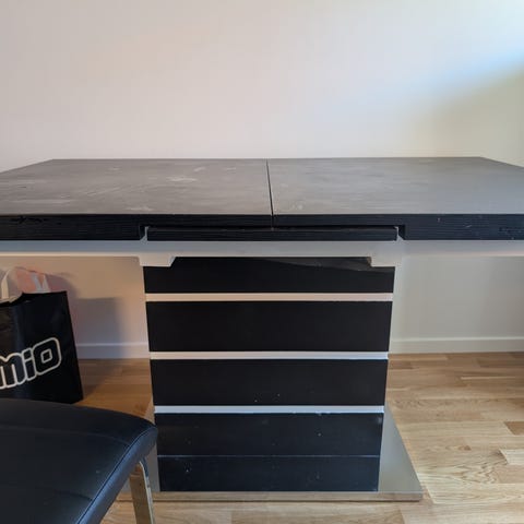 Svart trä matbord med räfflade sidor från bygghemma i mycket bra skick. 200cm lång.