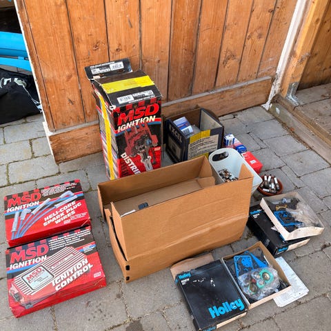 En v8 motor från 1970 talet som suttit i en Van, inklusive luftrenare, generator, fördelare och startmotor. Den fungerade bra när den togs ur bilen.