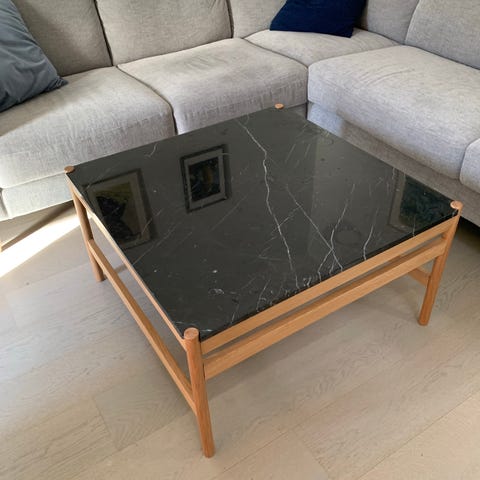 soffbord med mosaikskiva formgivet . Bordet är fyrkantigt med träram och ben i mörkare träton. Bordsskivan består av mönstrade mosaikplattor i bruna och beige nyanser med oregelbundna former. Passar som soffbord eller sidobord i vardagsrum eller sällskapsrum.