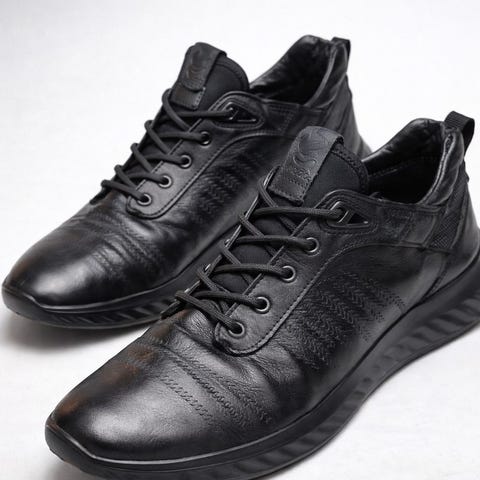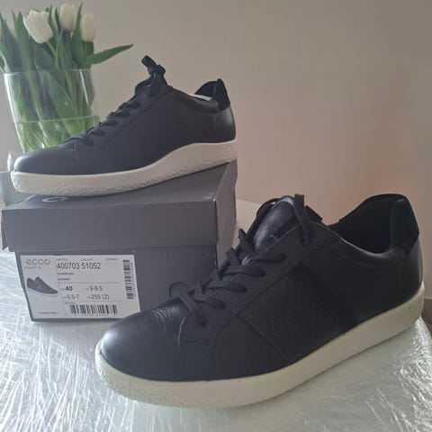 Ecco sneakers i storlek 41. Modellen har svart ovandel med tre kardborreband och vit yttersula. Skorna är låga och lämpar sig för vardagsbruk och promenader. Neutral design som passar till många olika klädstilar.