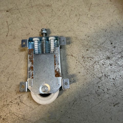 Skjutdörrsbeslag med hjul i metall. Beslaget har fjäderbelastat hjul i plast och är avsett för montering i skjutdörrar eller skåpsdörrar. Metallkapsling med fästhål för infästning i dörrblad eller karm. Lämpligt som reservdel eller utbyte i befintliga skjutdörrssystem.