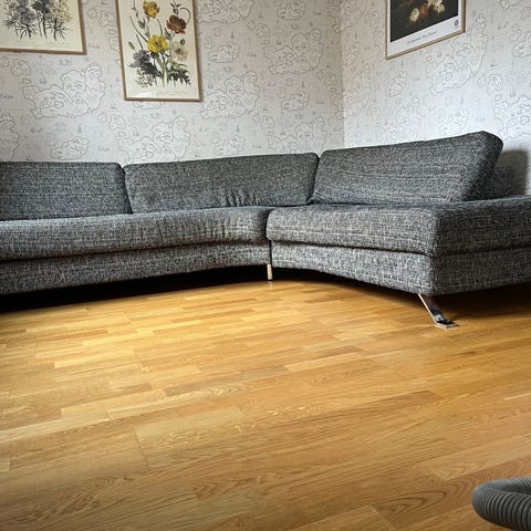 Säljer en blå hörnsoffa med schäslong. Stilren modell med smala armstöd och ben i mörkt trä. Se bild.