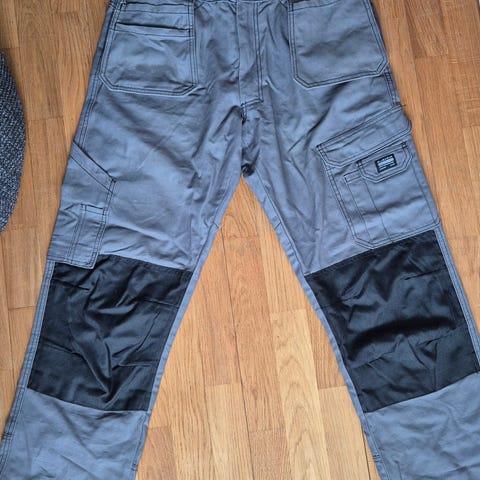 Fristads varselbyxa i storlek C42. Byxan är gul med marinblå partier och reflexband nedtill på benen. Modellen är regular och avsedd som arbetsbyxa med flera fickor och hållare för verktyg. Plagget är märkt enligt Oeko-Tex Standard 100. Storleksangivelser på etikett: kroppslängd cirka 164–172 cm, midjevidd cirka 94–98 cm och stussvidd cirka 78–82 cm.