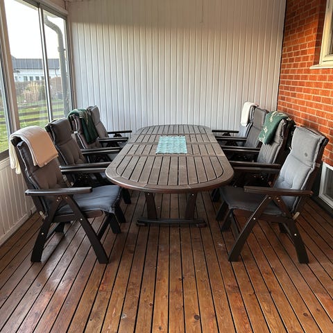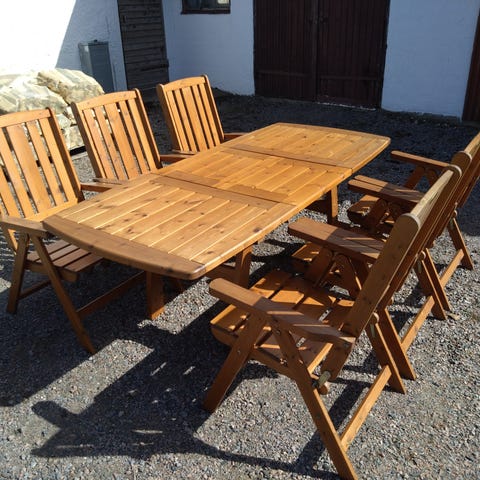 Trädgårdsgrupp med rektangulärt bord och flera stolar i trä. Möbelgruppen är i brun träfärg och passar för uteplats, altan eller trädgård. Stolarna har hög rygg och armstöd, kan justeras .