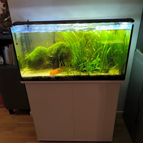 - Fiskar (fem scalarer varav ett lekpar som fått fram yngel (se bild), plattys och ancistrus)