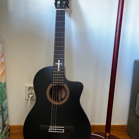 Ibanez halvakustisk gitarr i svart utförande. Kroppen är tunn med telecaster-liknande form och har inbyggd elektronik med reglage på sidan för volym och tonkontroll. Gitarren har nylonsträngar, stall i trä och bandad greppbräda med dekorativa inlägg. Baksidan och halsen är mörka, och instrumentet är avsett för högerhänta spelare. Passar för förstärkt spel via förstärkare eller PA-system samt akustiskt spel i hemmiljö eller mindre sammanhang. Ibanez TOD 10N-TKF Tim Henson Signature