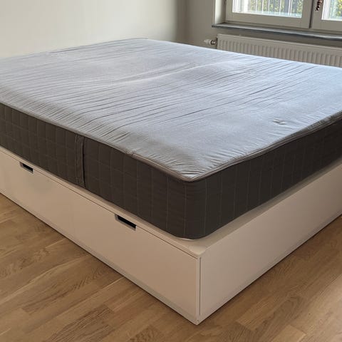Ikeas Nordli. Passar för madrass 90 cm. 3 st lådor med mycket förvaring. Sänggaveln fäster du enkelt i väggen, även den med extra förvaring i form av 2 lådor/hyllplan. Perfekt för mobil, klocka eller en bok. På madrassbotten finns några skrapmärken, men inget som stör när madrassen ligger på.
