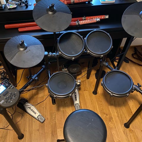 Medeli DD-502 elektroniskt trumset. Setet består av flera trumplattor och cymbalpads monterade på stativram, samt tillhörande trummodul DD-502 med reglage och anslutningar. Passar för övning och spel i hemmamiljö med möjlighet att använda hörlurar eller extern förstärkare beroende på anslutningarna på modulen.